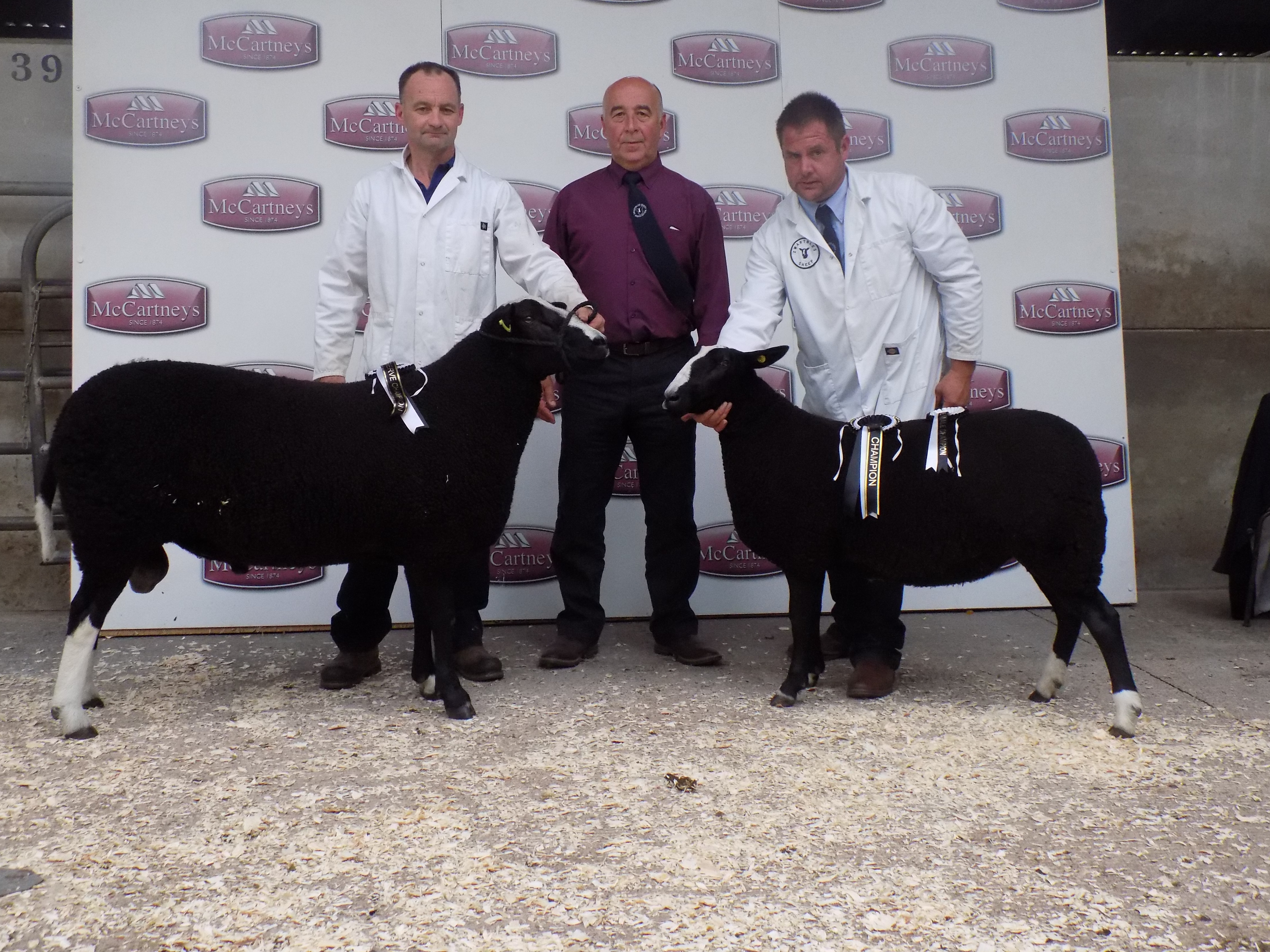 L to R – Male and Reserve Overall Champion Lot 241, G & L Owen, judge Cyril Cromie, Female and Overall Champion Lot 321, J Kestell